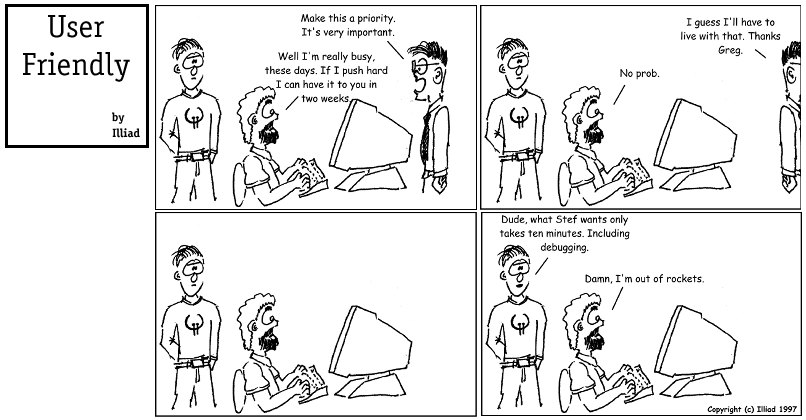 UserFriendly.Org and its operators are not liable for comments or content posted by its visitors, and will cheerfully assist the lawful authorities in hunting down script-kiddies, spammers and other net scum. And if you're really bad, we'll call your mom. (We're not kidding, we've done it before.)
